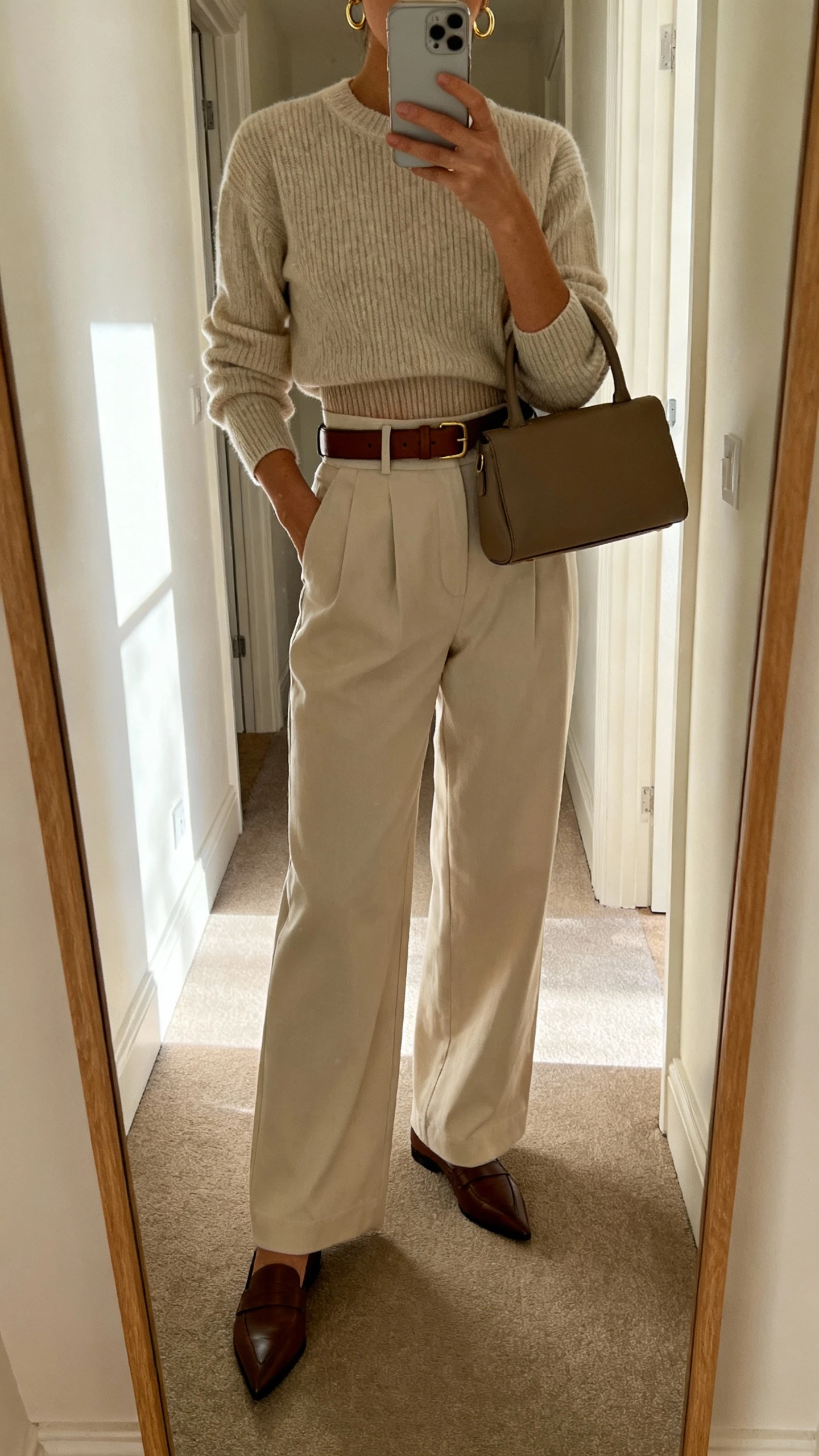 2. High-Waisted Wide-Leg Trousers With a Waist-Defining Knit That Looks Old Money On Arrival