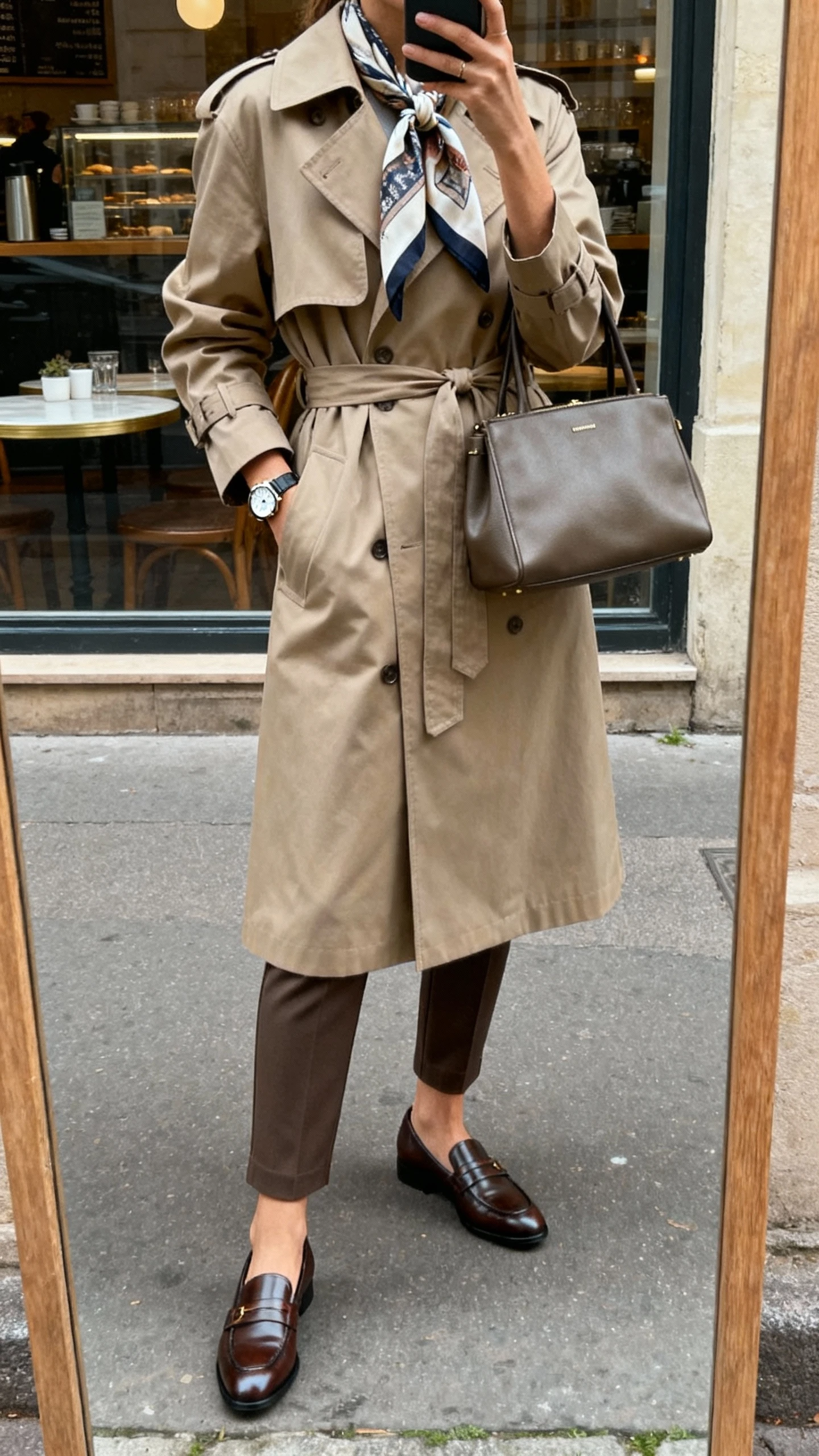 Wear it to meetings, museums, or dinner with friends. For an evening flip, swap the trousers for a slip skirt and the loafers for kitten heels. A silk scarf under the trench collar adds an old-school, head-turning detail.