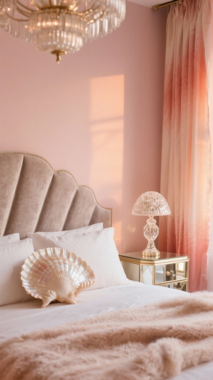 Opt for a curved upholstered bed in pale taupe velvet with scalloped edges. Add mirrored nightstands, crystal mushroom lamps, and silk drapes with a subtle coral ombré.