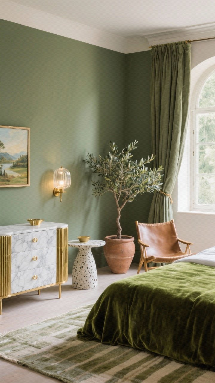 Grounded and green, yet glam. Use sage-loden walls and an upholstered bed in moss velvet to echo olive leaves, then contrast with luminous brass and marble.