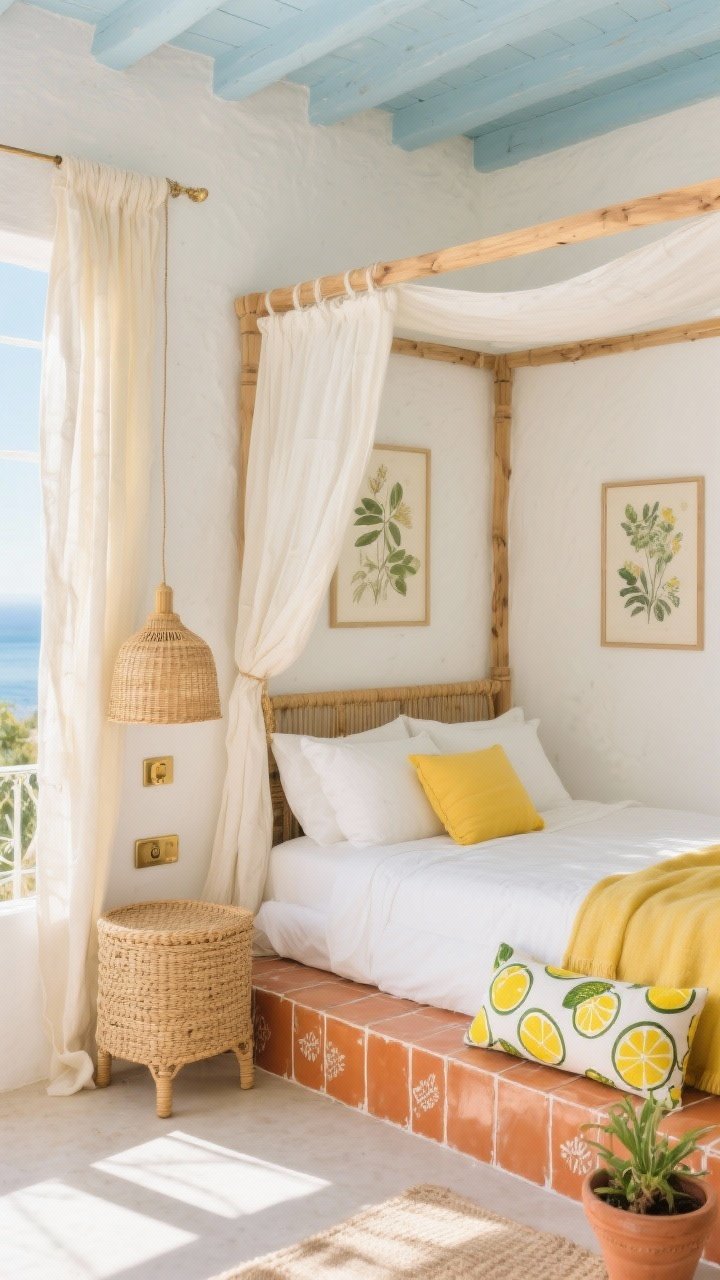 Choose a natural oak canopy bed with crisp white percale bedding and pops of citrus yellow and terracotta in pillows and throws. A hand-painted terracotta-tiled bench at the foot adds artisan charm.