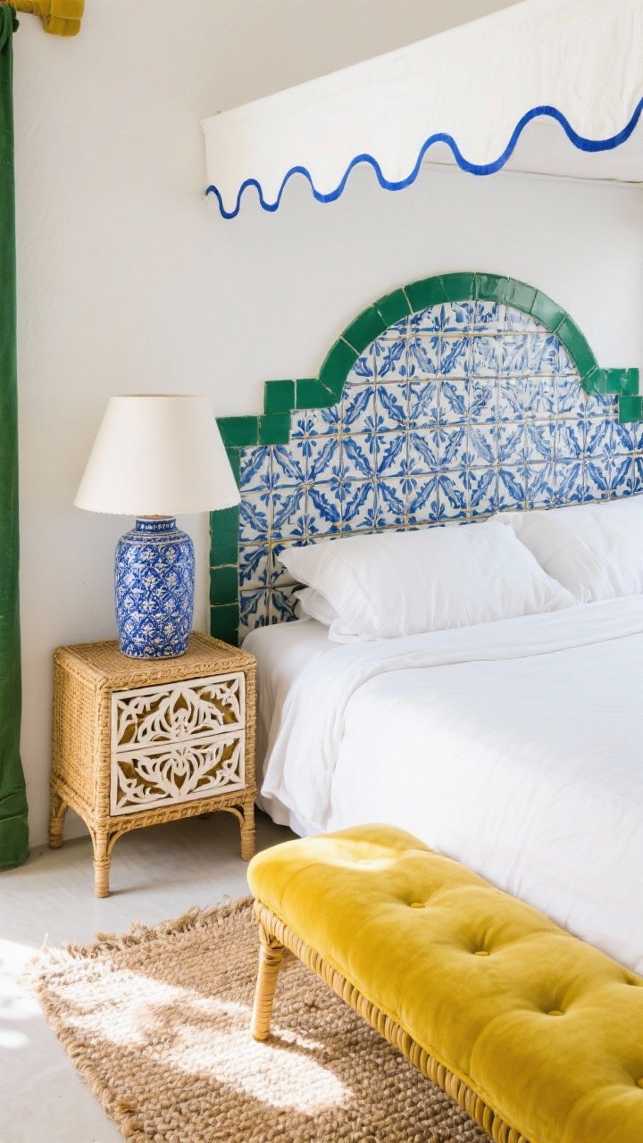 Pattern-forward and joyfully coastal. Use hand-painted tile motifs as your star—either real cement tile as a headboard wall or wallpaper with a cobalt-and-white maiolica print.