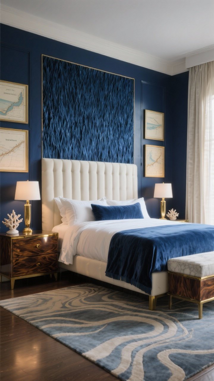 This one leans into deep sea drama with a polished finish. Start with lacquered navy walls or a moody sapphire grasscloth behind the bed to channel Mediterranean depth.