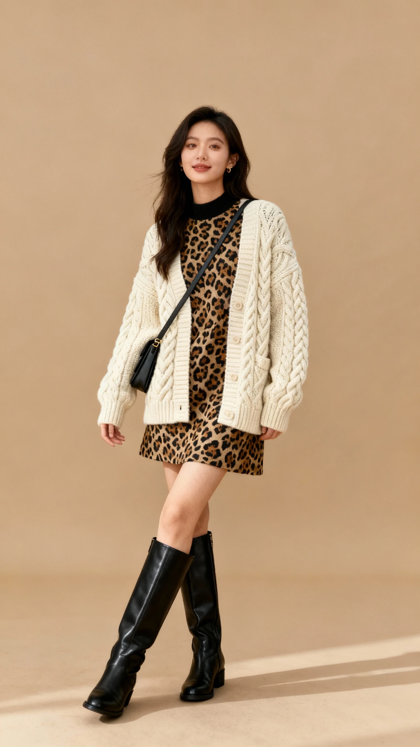 Throw a chunky knit over a leopard dress and suddenly it’s cozy-luxe perfection. It’s the “I just layered this and walked out” vibe that still feels intentional. The knit tones down the pattern and makes it totally daytime-friendly.