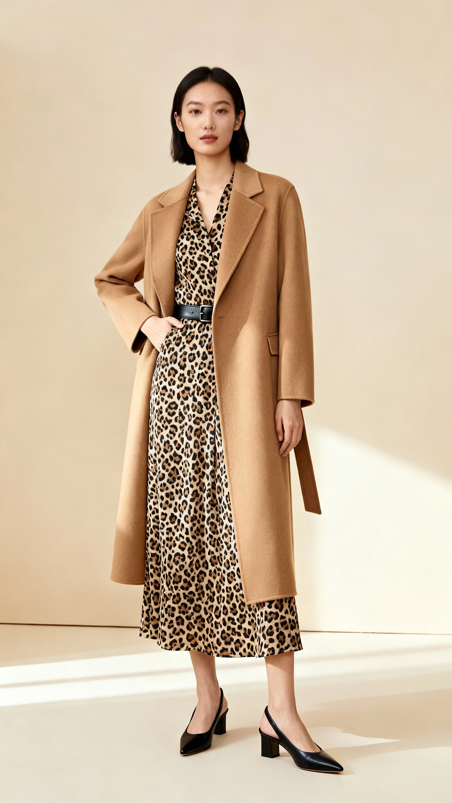 This is the no-fail formula: a sleek leopard midaxi dress wrapped in a structured coat. Minimal, clean, and incredibly expensive-looking. The coat smooths the print, the length elongates your silhouette, and together they say “I invest in pieces, not trends.”