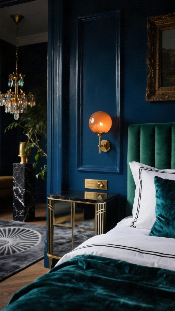 Turn down the lights: ink-blue lacquered walls, a channel-tufted emerald headboard, and smoked-mirror nightstands that reflect soft amber. The bed wears hotel-white sateen piped in black, topped with a peacock velvet coverlet.