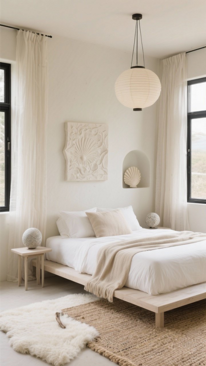 This one is a whisper: limewashed sand-colored walls, a white oak platform bed, and floor-to-ceiling sheer drapery that moves with the breeze. The rug is a flatweave jute blend layered under a plush ivory wool, so your feet hit softness first.