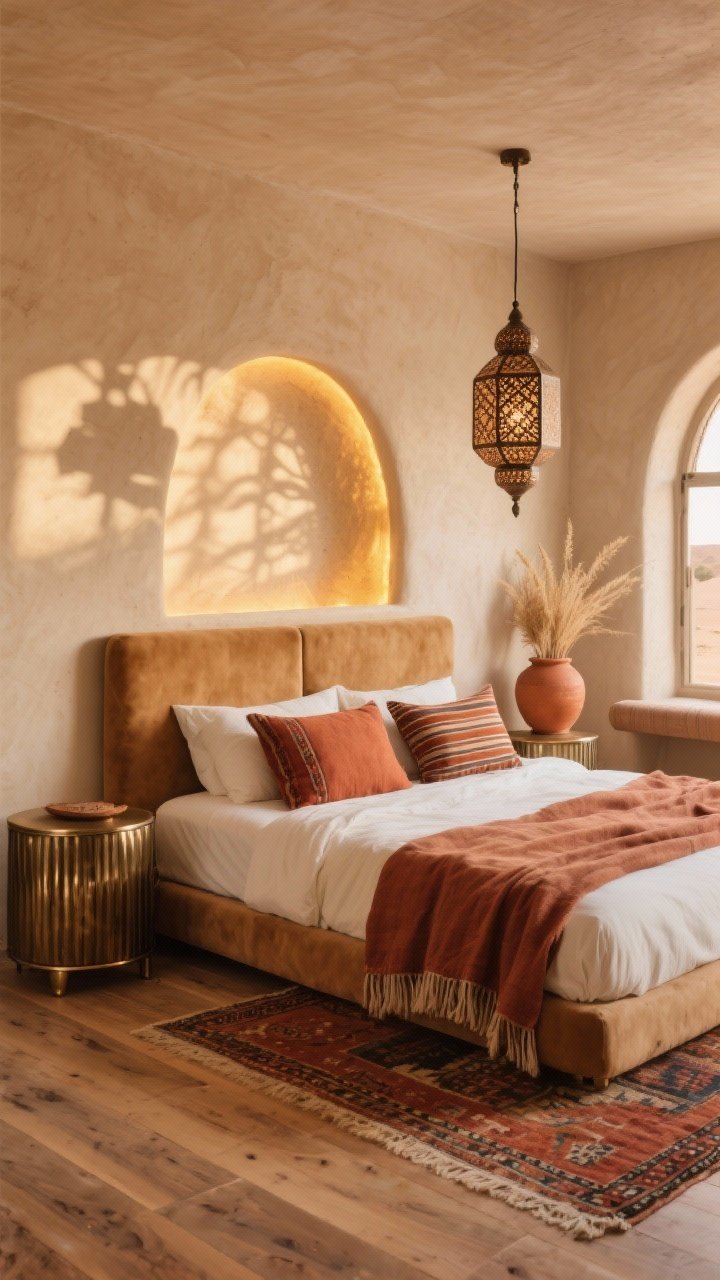 Textiles lean earthy: rust linen euro shams, a striped kilim throw, and ecru percale sheets. A Moroccan-style pendant casts patterned shadows, while a terracotta urn with dried grasses anchors the corner.