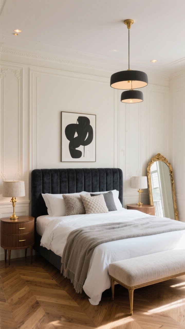 Imagine a sun-washed room with cream walls, tall molded paneling, and a charcoal velvet headboard that stretches nearly to the ceiling. The floor is classic herringbone oak—instant boutique energy. A vintage-style brass picture light highlights a black-and-white abstract above the bed.