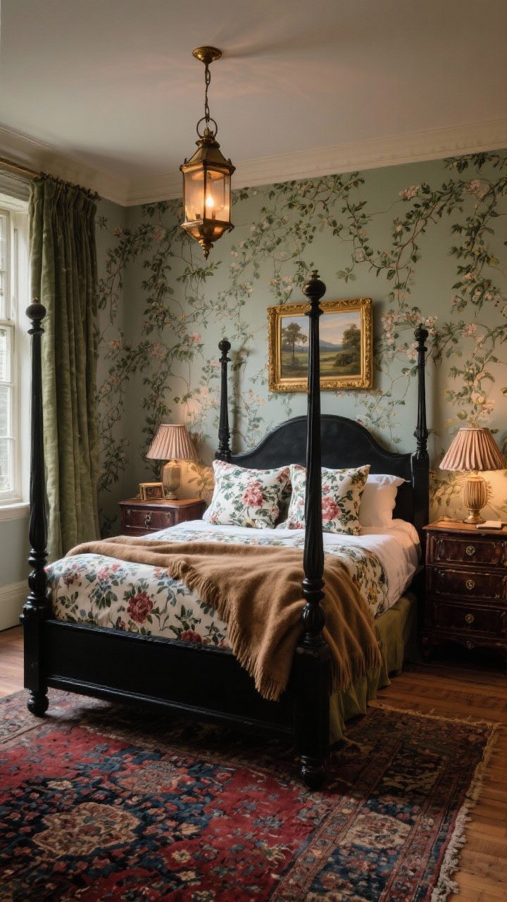 Think grand but livable. A black four-poster bed anchors the room, layered with floral chintz pillows and a camel wool blanket. Walls wear a muted vine wallpaper, balanced by thick linen drapes in moss.
