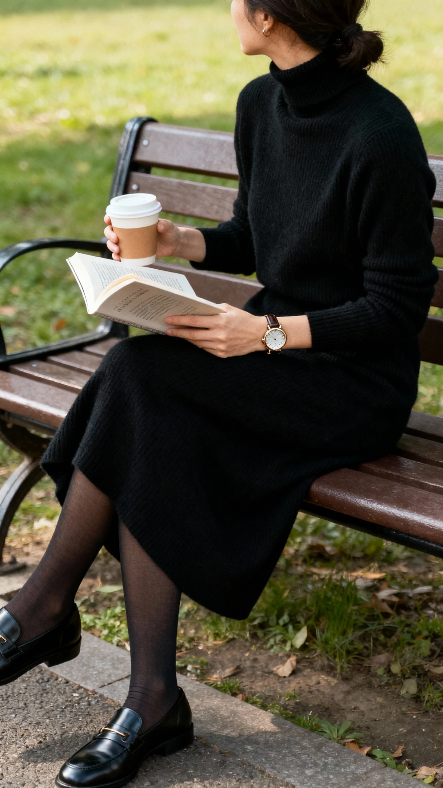 - Black cashmere turtleneck dress (midi length, straight or gentle A-line)