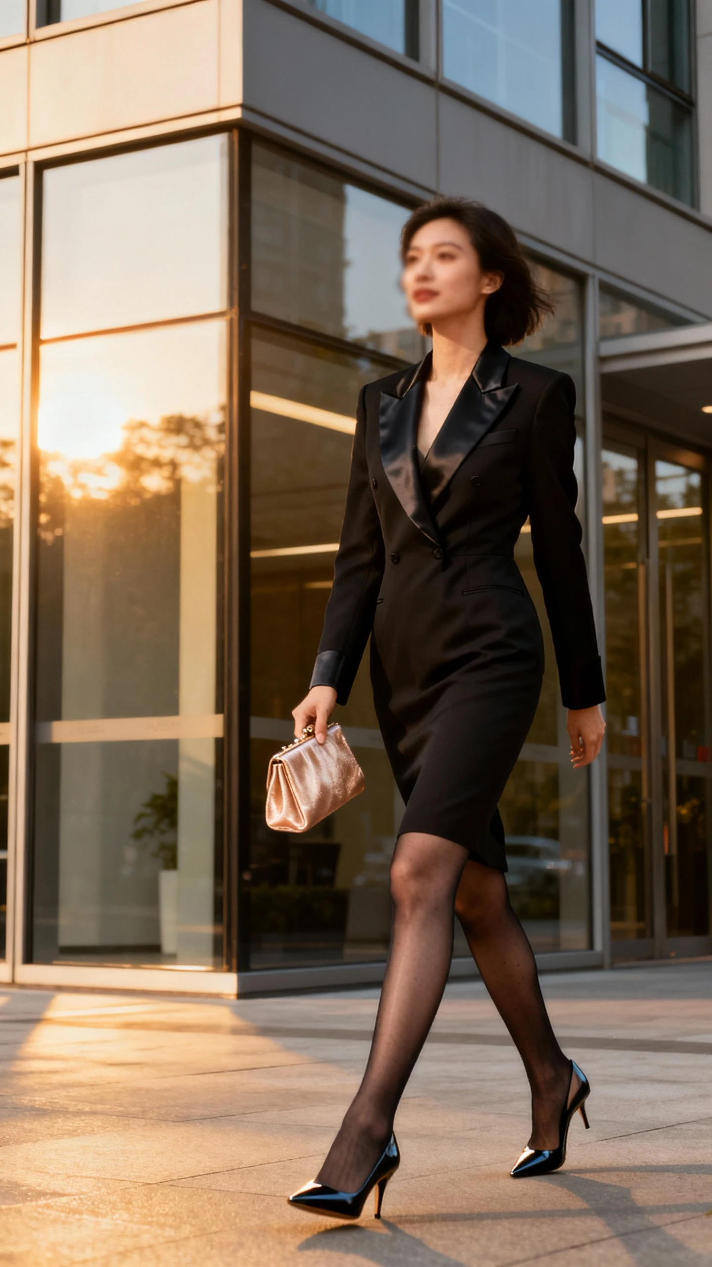 - Black tuxedo dress (double-breasted, nipped waist, mid-thigh to knee length)