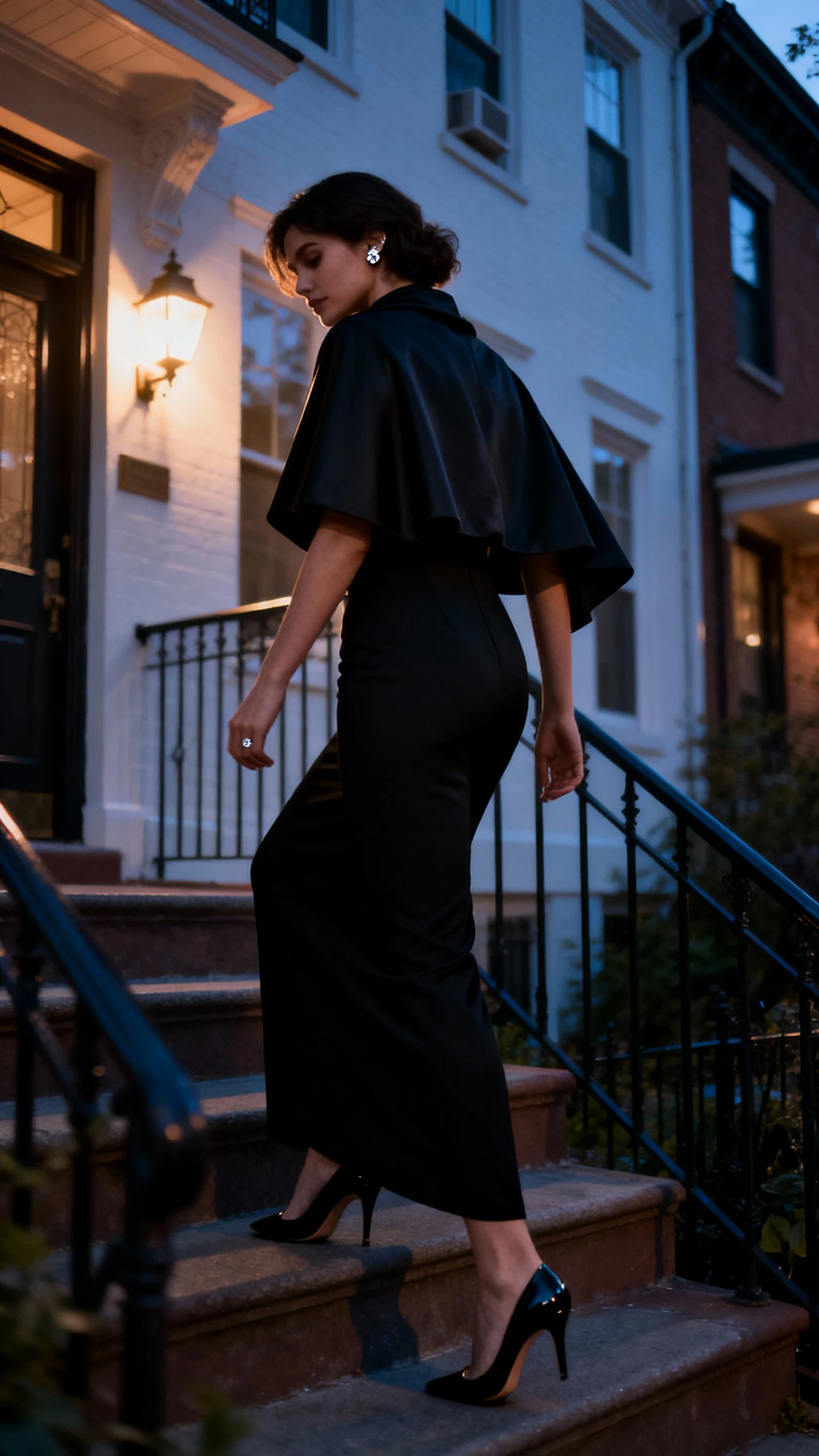 - Hair either fully up or very sleek and tucked; let the neckline and cape be the hero.