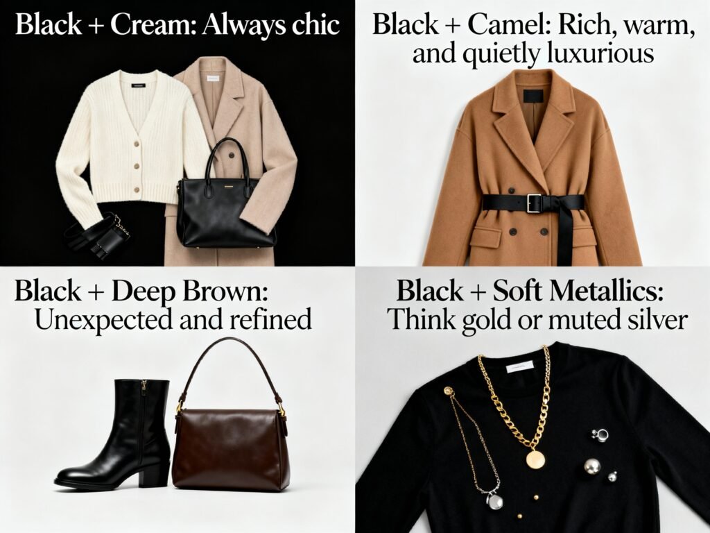 - Black + Camel: Rich, warm, and quietly luxurious. Perfect for outerwear and belts.