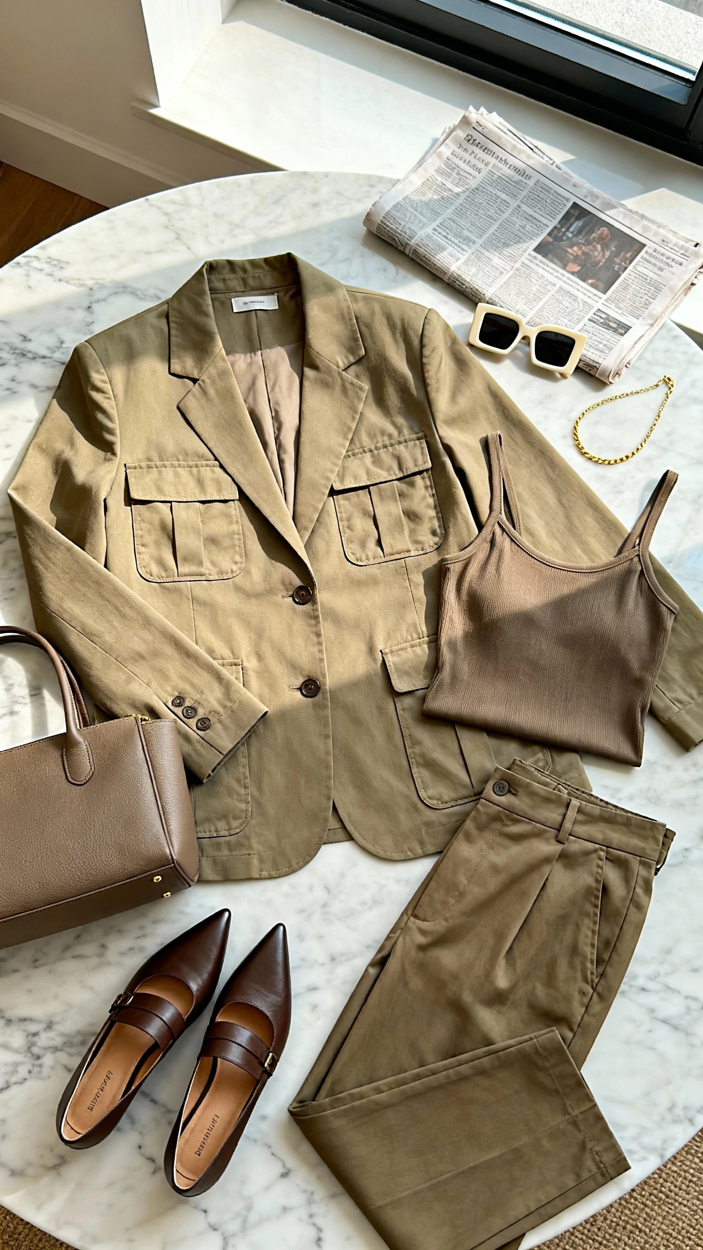 For the day you want to look put-together and powerful, a relaxed safari suit brings movie-star energy. Think tailored shorts or tapered trousers with a matching utility blazer. It’s polished without being precious, and it photographs like a dream.