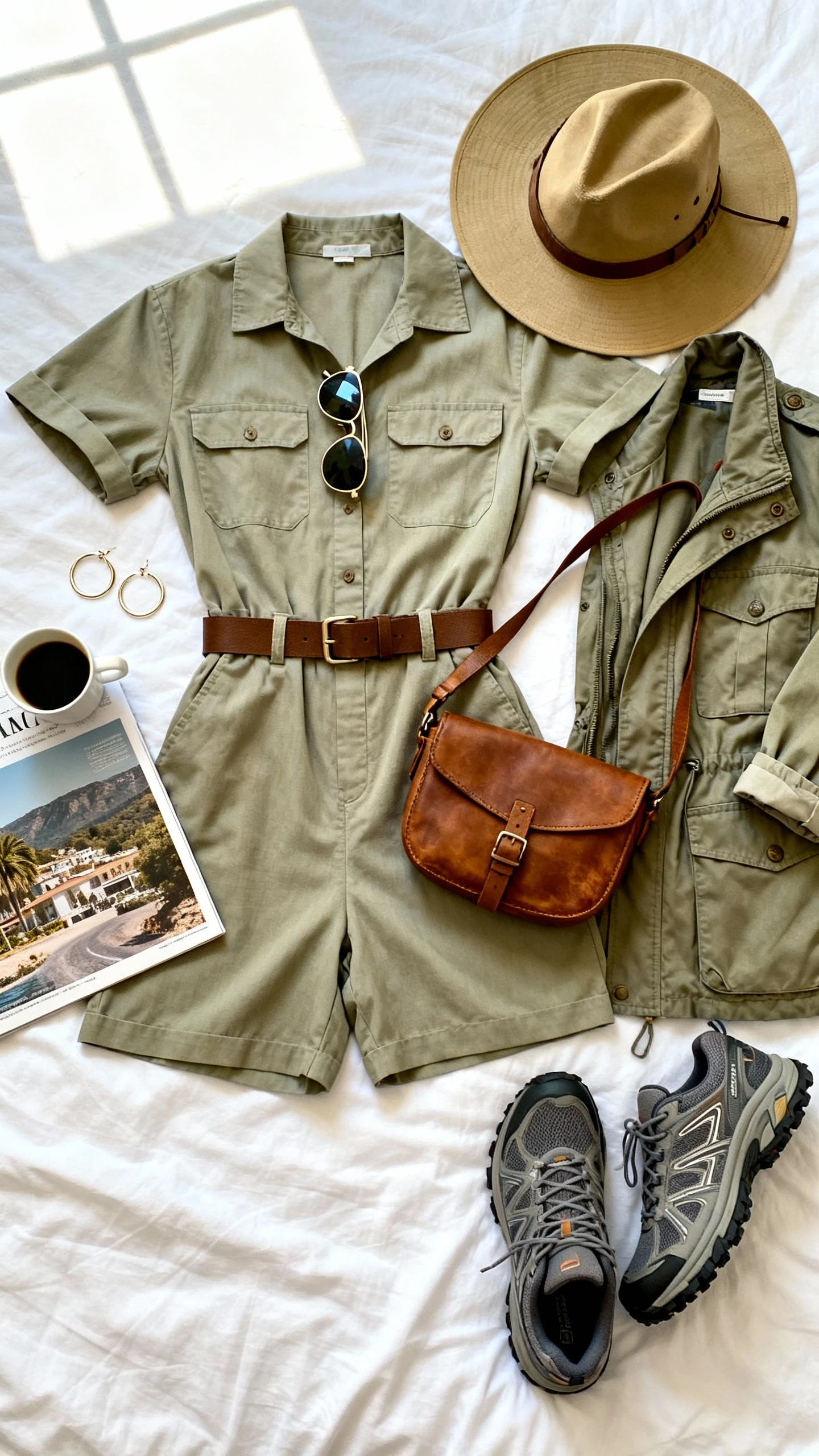 This is the one-and-done outfit that says “I’m prepared” without trying too hard. A lightweight utility jumpsuit gives you pockets for days, a cinched waist, and a streamlined silhouette. It moves easily, breathes in heat, and looks polished in every photo—no outfit fussing required.