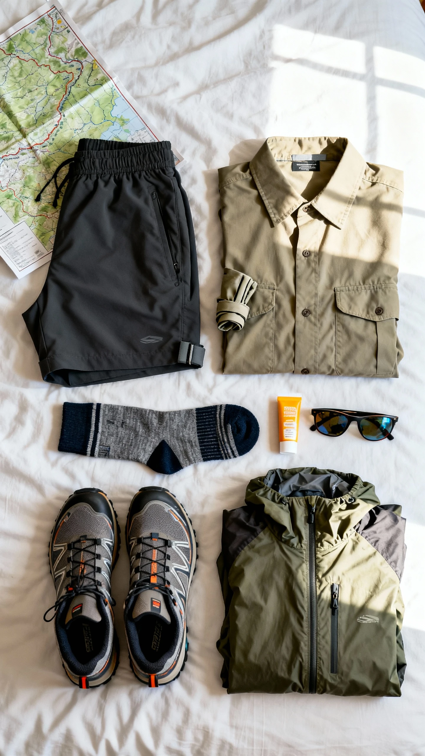 - Outer: Packable windbreaker or overshirt for gusty conditions.