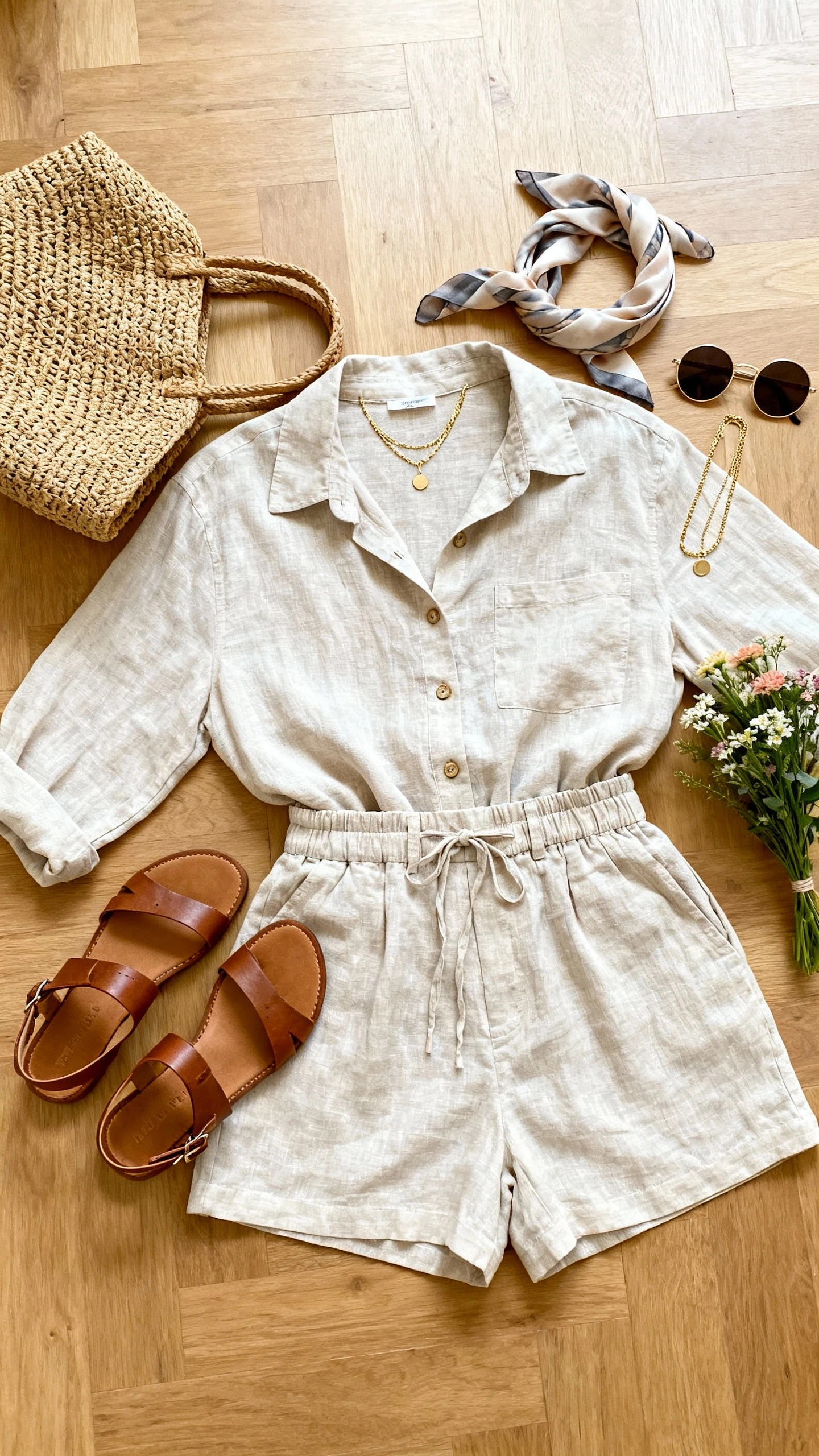 - Linen drawstring shorts or relaxed trousers in matching or coordinating shade