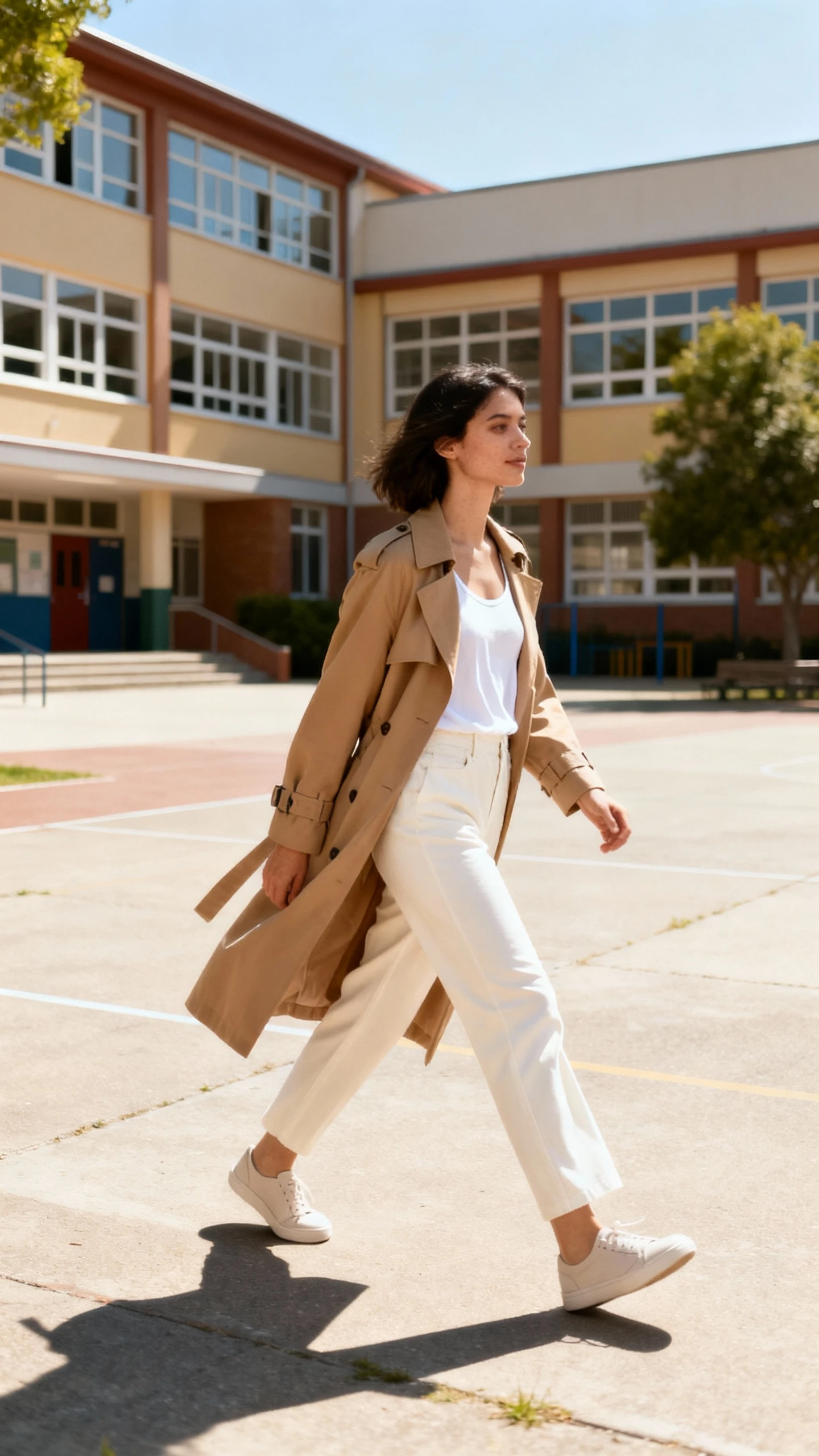 6. Camel Trench, Breezy Tank, And Rail-Flat Trousers