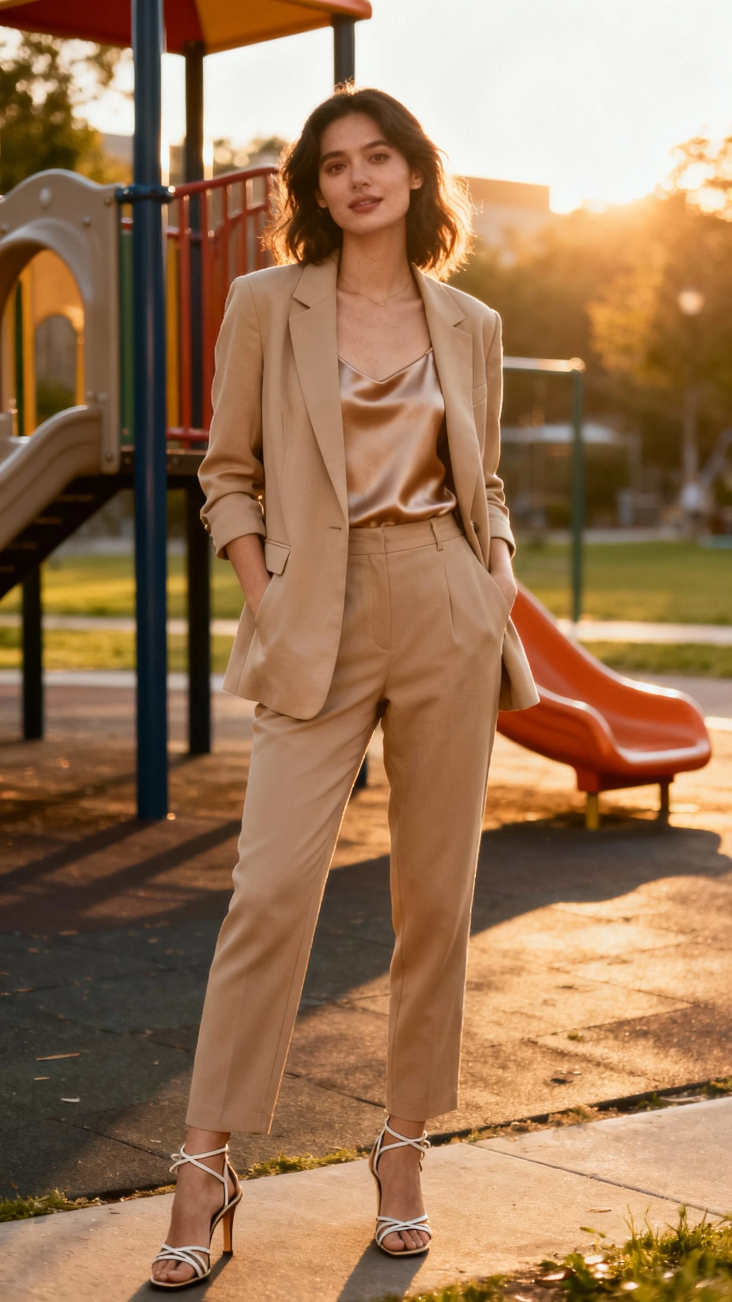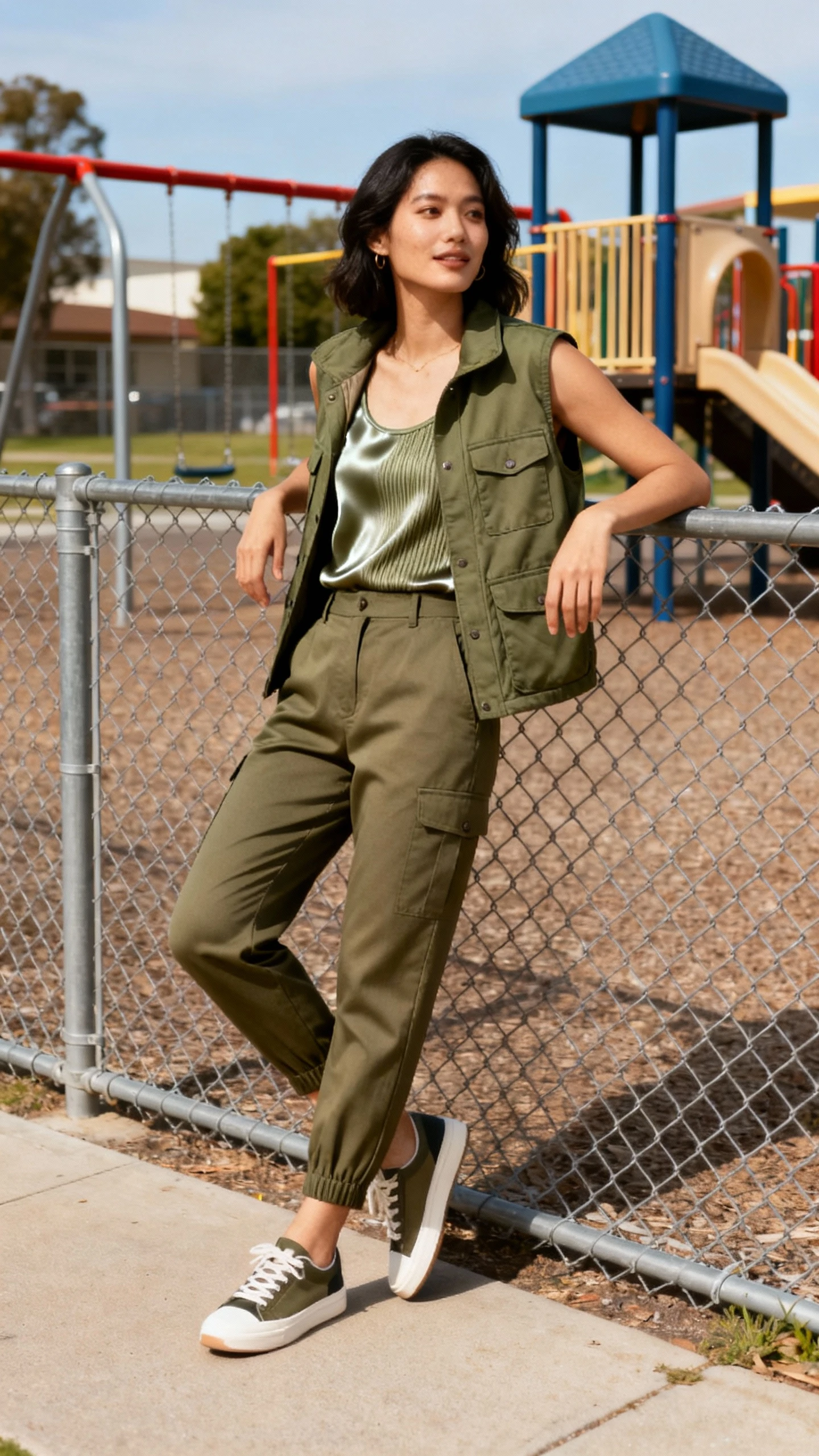 This outfit balances function with quiet richness: a sleek field vest over a soft silk-blend knit. It looks editorial-level intentional while holding essentials—lip balm, lens cap, snacks—without bulging pockets.