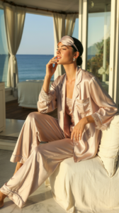 Think luxe hotel energy: silk pajama set with crisp details and lace accents. It’s polished, chic, and ridiculously comfortable. You’ll feel like you’re on a private yacht, even if it’s just a cute boutique hotel.