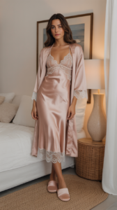 This combo is pure old-Hollywood romance. A silk chemise under a sweeping satin robe feels dramatic but not overdone. The movement when you walk? Unreal.