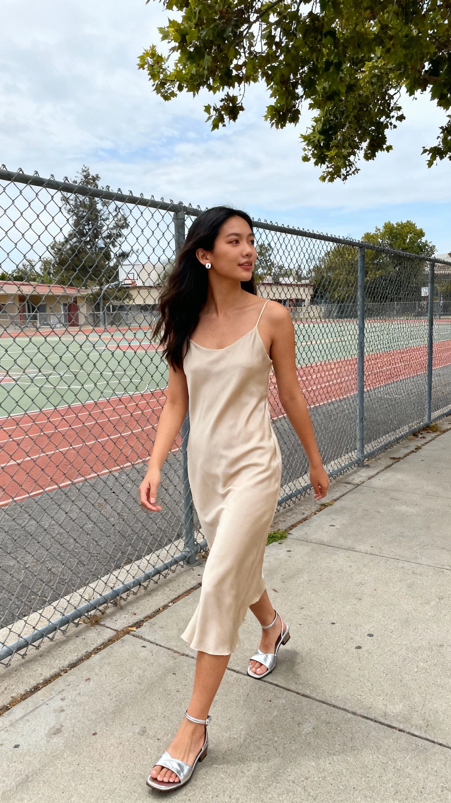 - Keep the silhouette sleek: a slip dress with gold sandals is chef’s kiss for minimal glam.