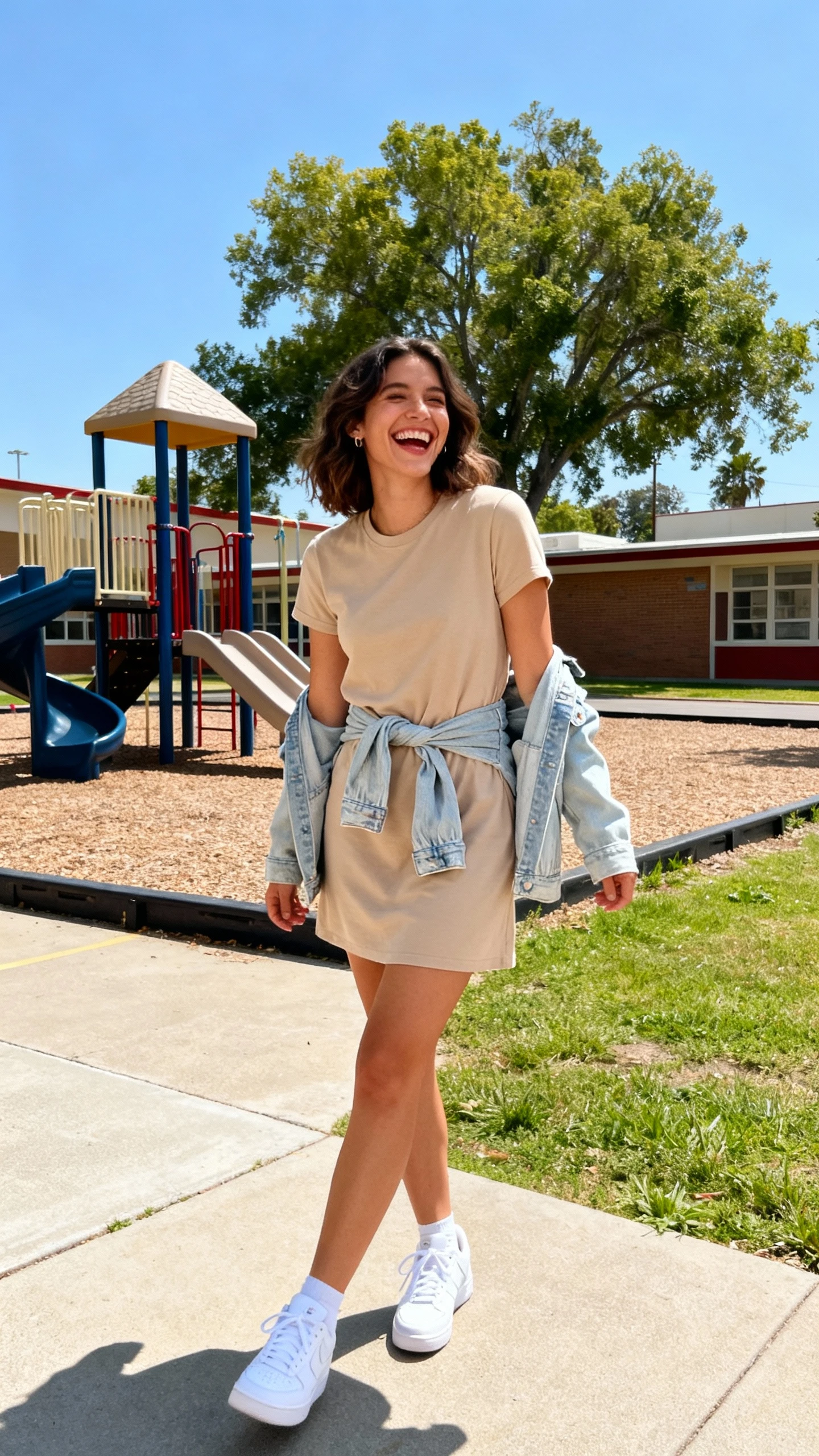 - Beige T-shirt dress, ribbed knit dress, or slip dress