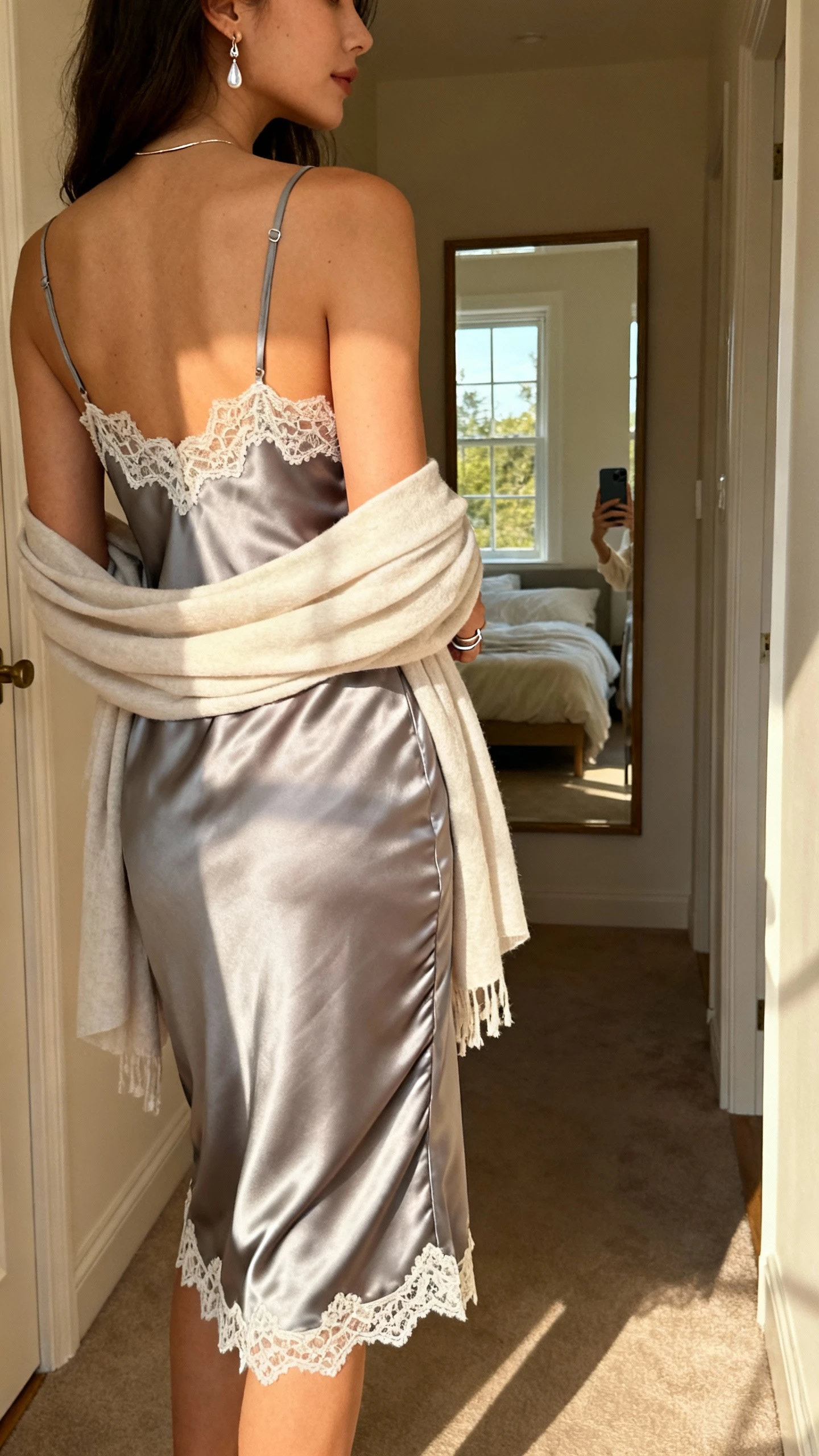 Perfect for journaling, herbal tea, or a late-night phone call with someone special. If you like a touch of texture, add a ribbed bralette under the satin. A soft shoulder throw or shawl makes it ultra-cozy for cooler evenings.