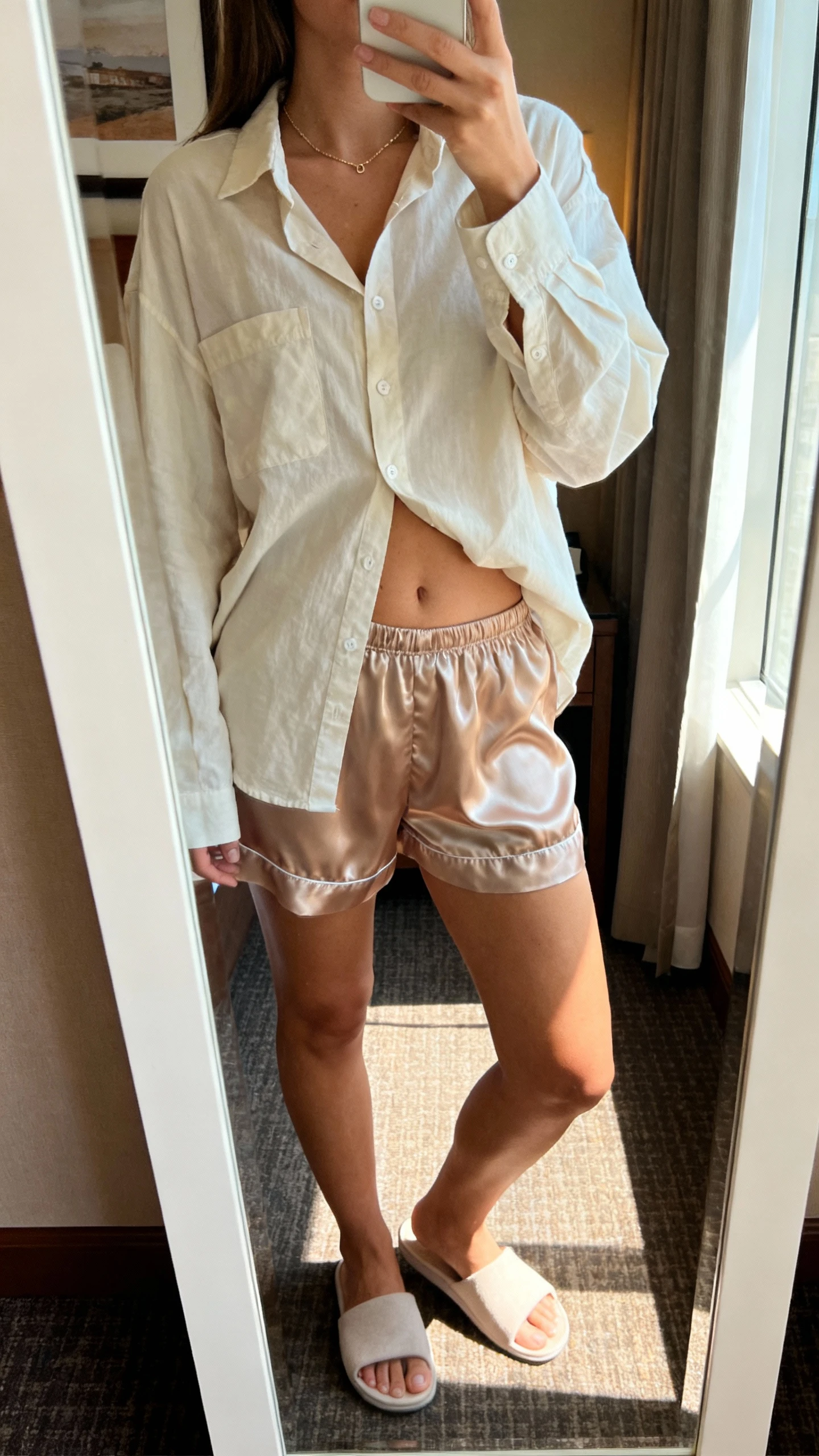 Borrow the crispness of a classic button-up and soften it with satin shorts and girly accents. It’s relaxed-meets-refined, which feels incredibly chic at home. Plus, the contrast of textures keeps the look interesting and romantic.