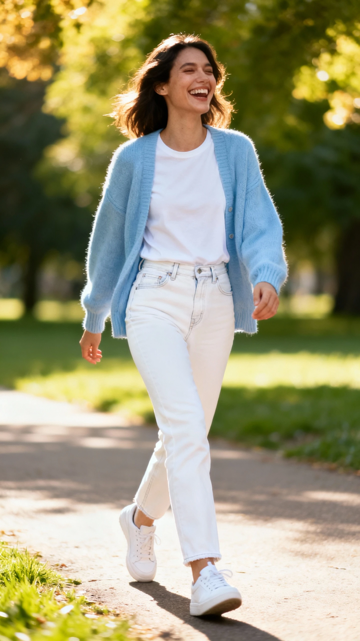 There’s something about a cloud-blue cardigan and crisp white denim that looks instantly clean and intentional. It’s bright without being loud, and it flatters nearly everyone. Wear it for coffee runs, farmers’ market strolls, or casual Fridays when you want compliments with your latte.