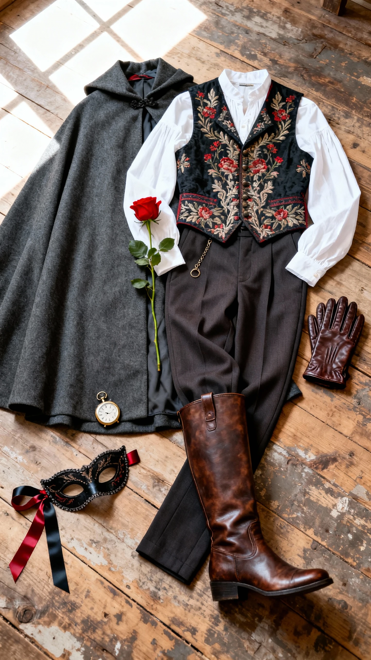 Take this to castle-themed venues, literary masquerades, or anywhere candlelight flickers. You can swap the cloak for a tailcoat if you prefer structured drama, or add a wide belt over the waistcoat for a heroic silhouette. You’ll look like you know where the map is hidden.