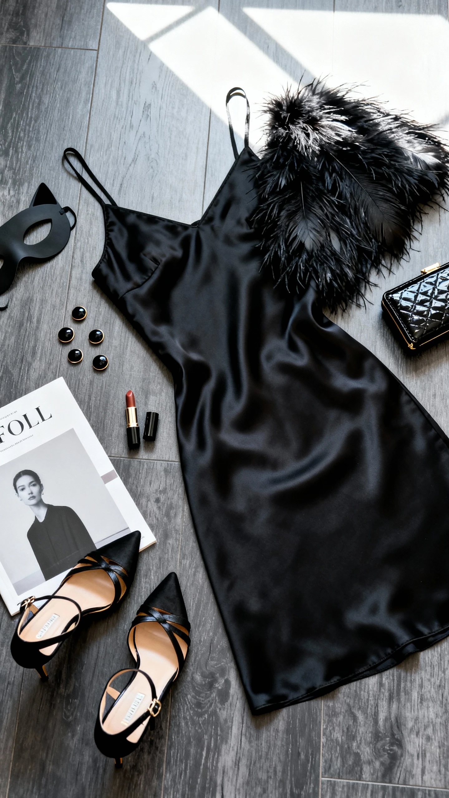 5. Opera Noir: Satin Slip, Feathered Shoulders, And A Cat-Eye Mask