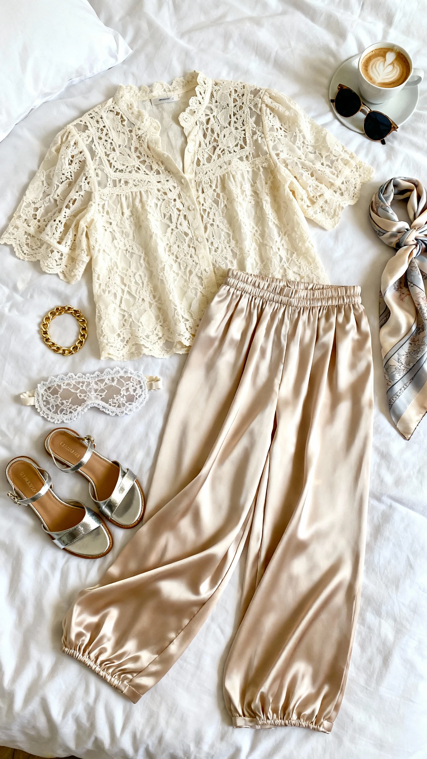 - High-waisted silk palazzo pants in cream, tan, or soft gold