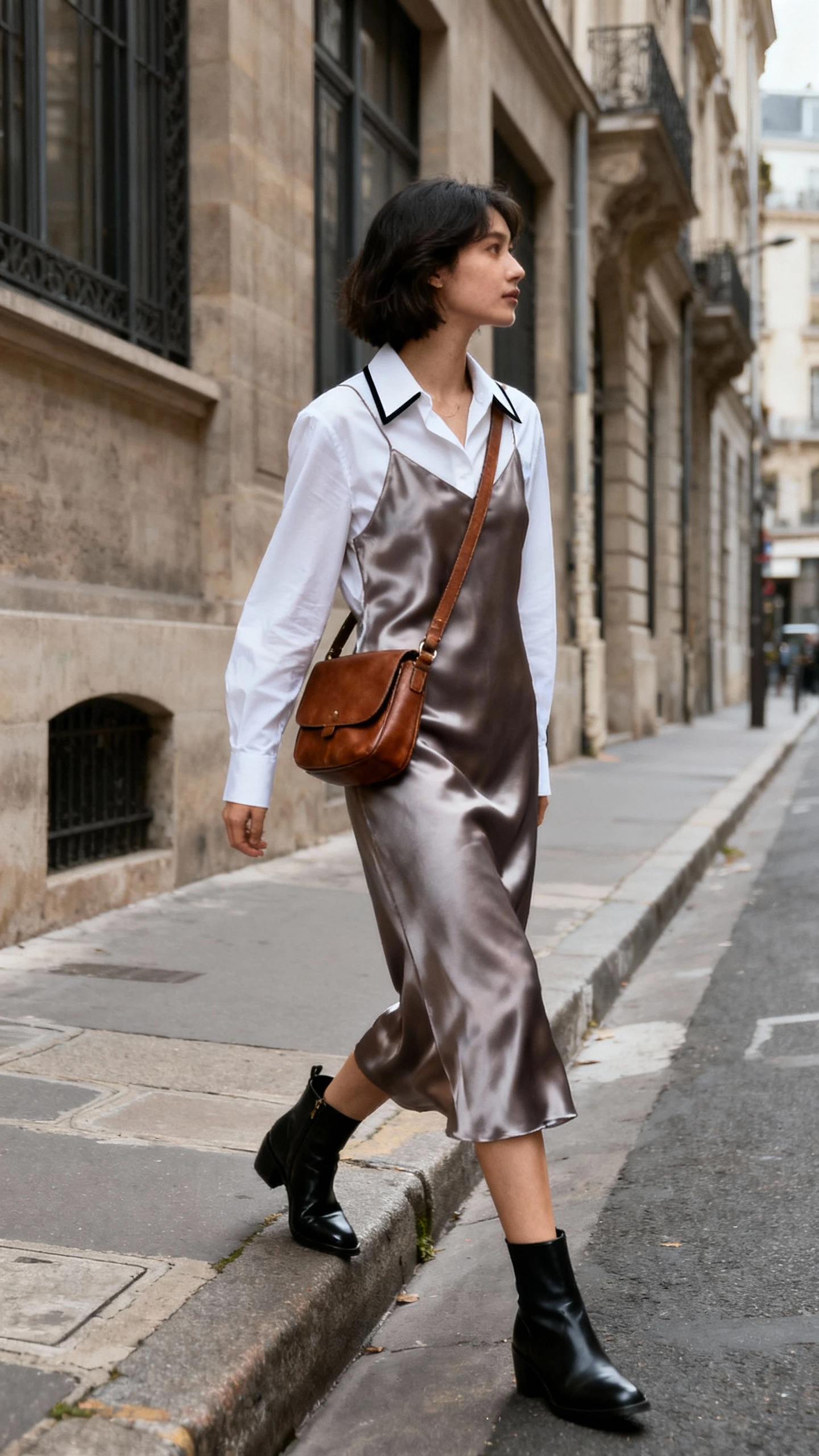 The lapel shirt meets glossy satin and suddenly it’s evening-ready without screaming “I tried.” This combo flows beautifully, looks luxe under dim lighting, and pairs with everything from strappy sandals to ankle boots.