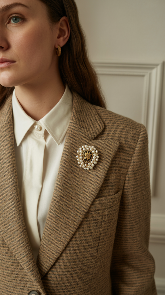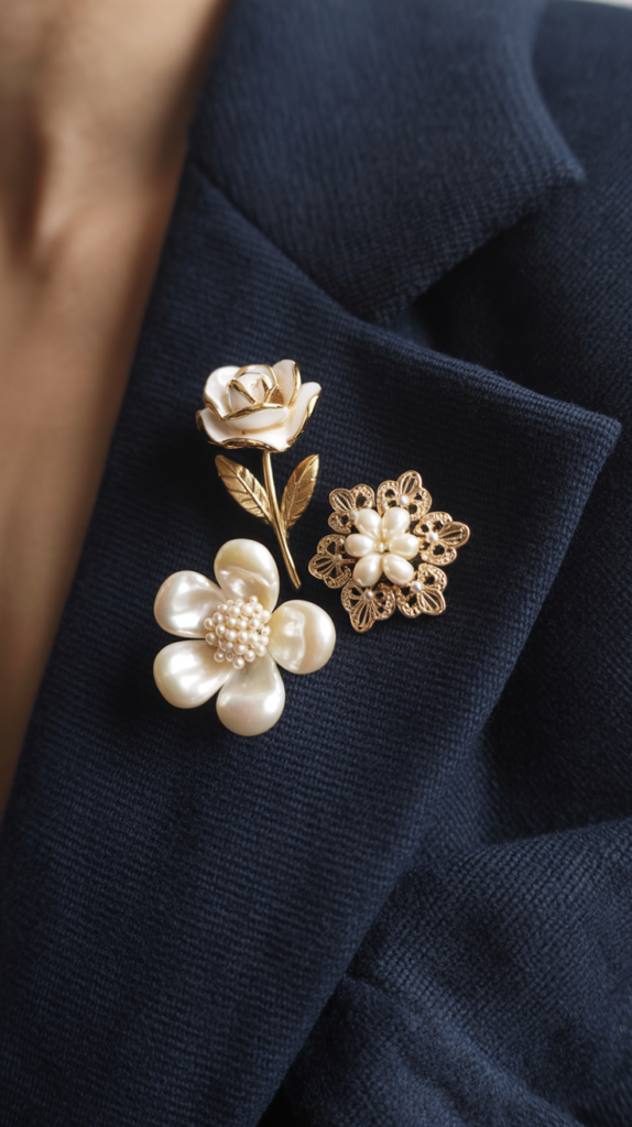 Pin one on the left lapel so it catches the light when you turn your head. Keep the jacket tailored and the brooch substantial—think pearl clusters, cabochon stones, or a vintage crest.