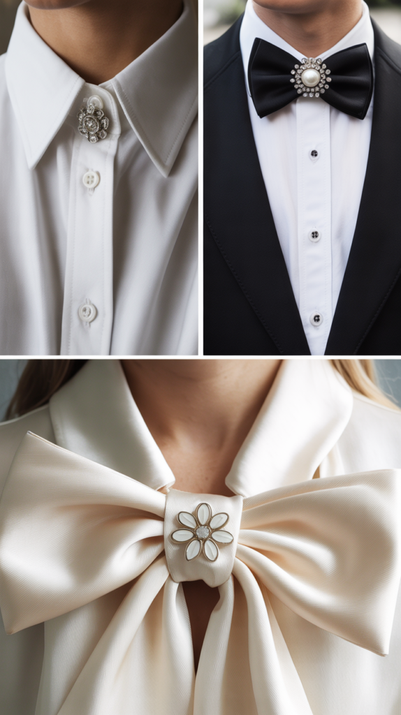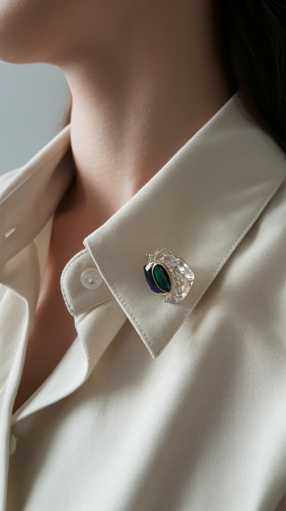 Pin a crystal or enamel brooch just peeking under one side of the collar. It’s flirty and understated—like a secret only you and good lighting know about.