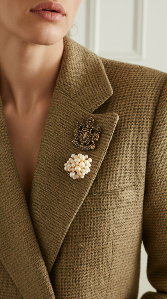 Pin a small crest or pearl piece on a tuxedo lapel, or a tasteful vintage motif on a blazer. Keep it subtle and let the tailoring shine.