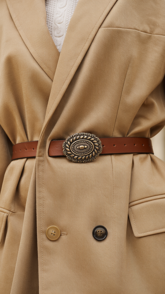 - Match metals: Gold brooch with a belt buckle in the same tone feels intentional.