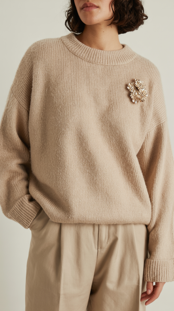A sparkly floral brooch + oatmeal cashmere = chef’s kiss.
