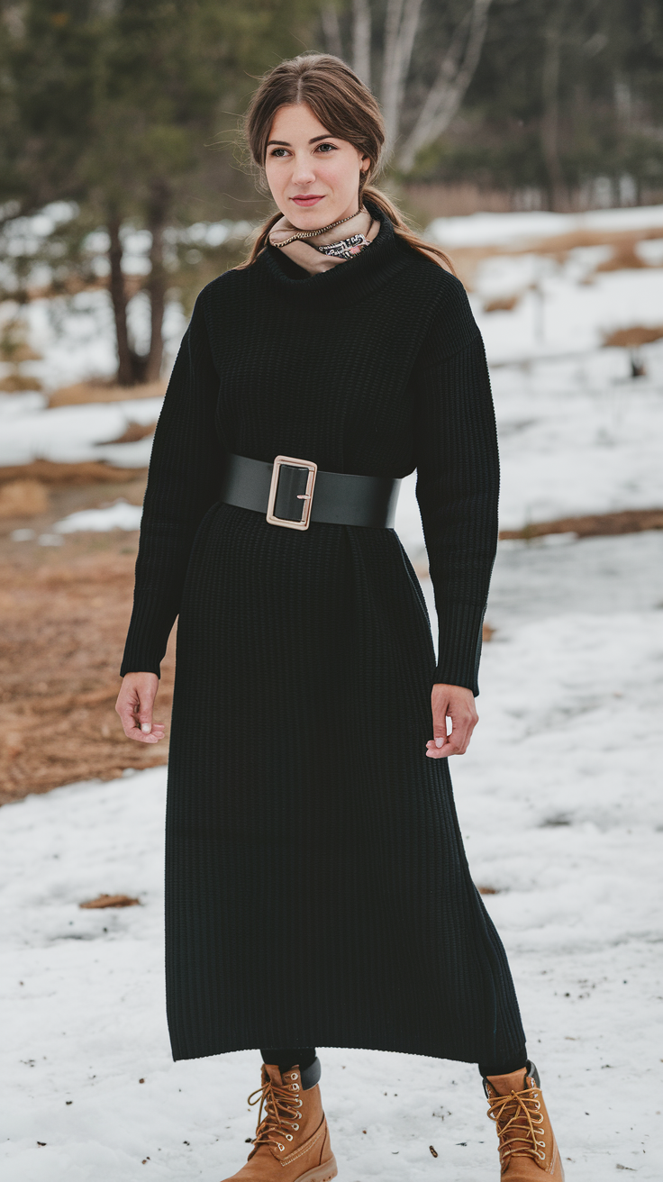 One-piece, zero-fuss chic. A sweater dress with Timberlands creates a soft, cozy silhouette. Cinch the waist with a statement belt to add shape and style.