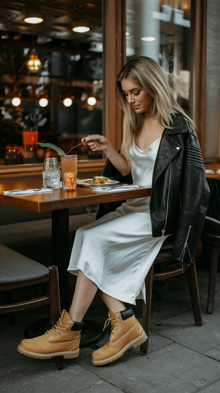Because sometimes you just want to feel soft and edgy at the same time. A slip dress under a leather jacket with Timberlands is unexpectedly balanced.