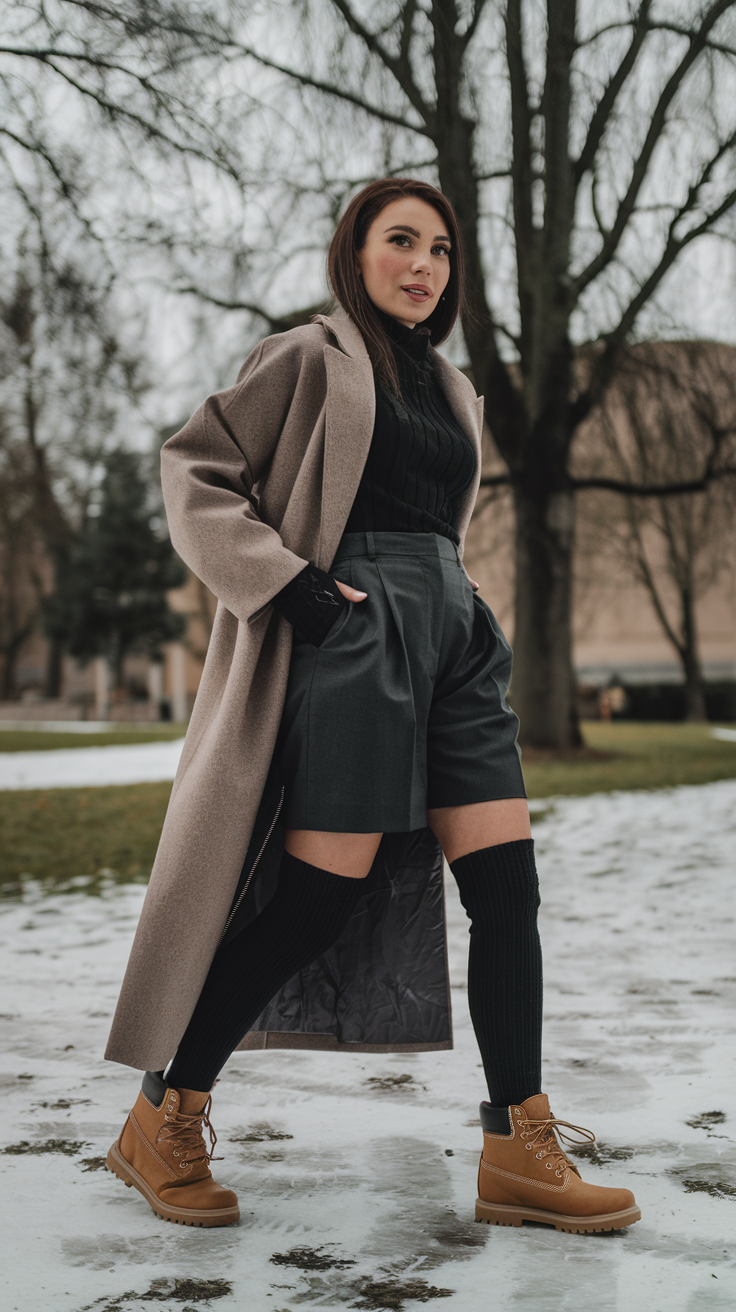 Yes, shorts in winter are possible if done right. Pair tailored shorts with Timberlands and a long wool coat for that chic contrast of rugged and polished.