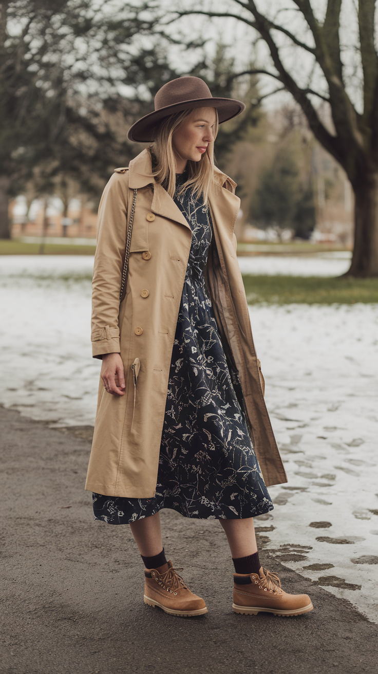 Classic meets rugged. A midi dress with a trench coat and Timberlands is effortlessly chic. Add a wide-brim hat for a little extra flair.