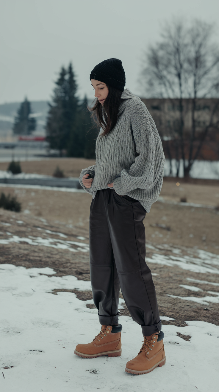 Edgy meets comfy. Leather pants add attitude while an oversized knit softens the look. Timberlands ground the outfit and keep it approachable.