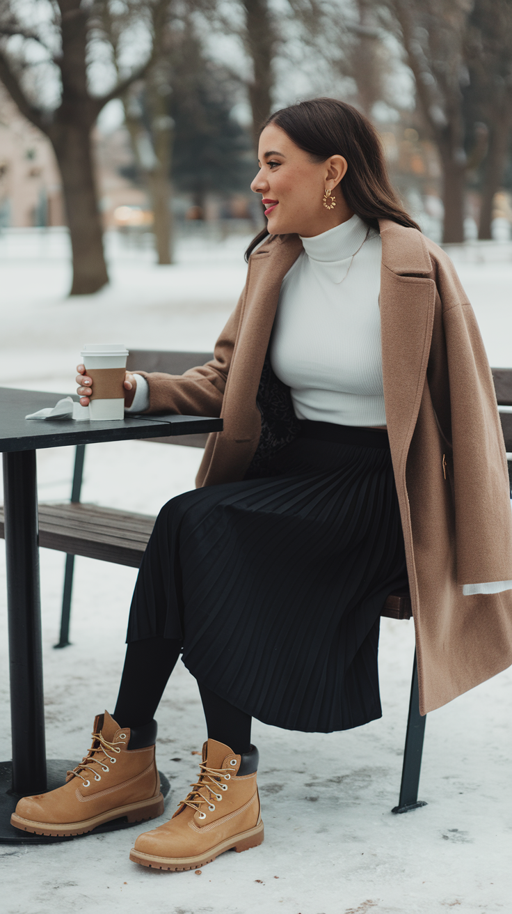 2. Timberlands + Pleated Midi Skirt + Fitted Turtleneck