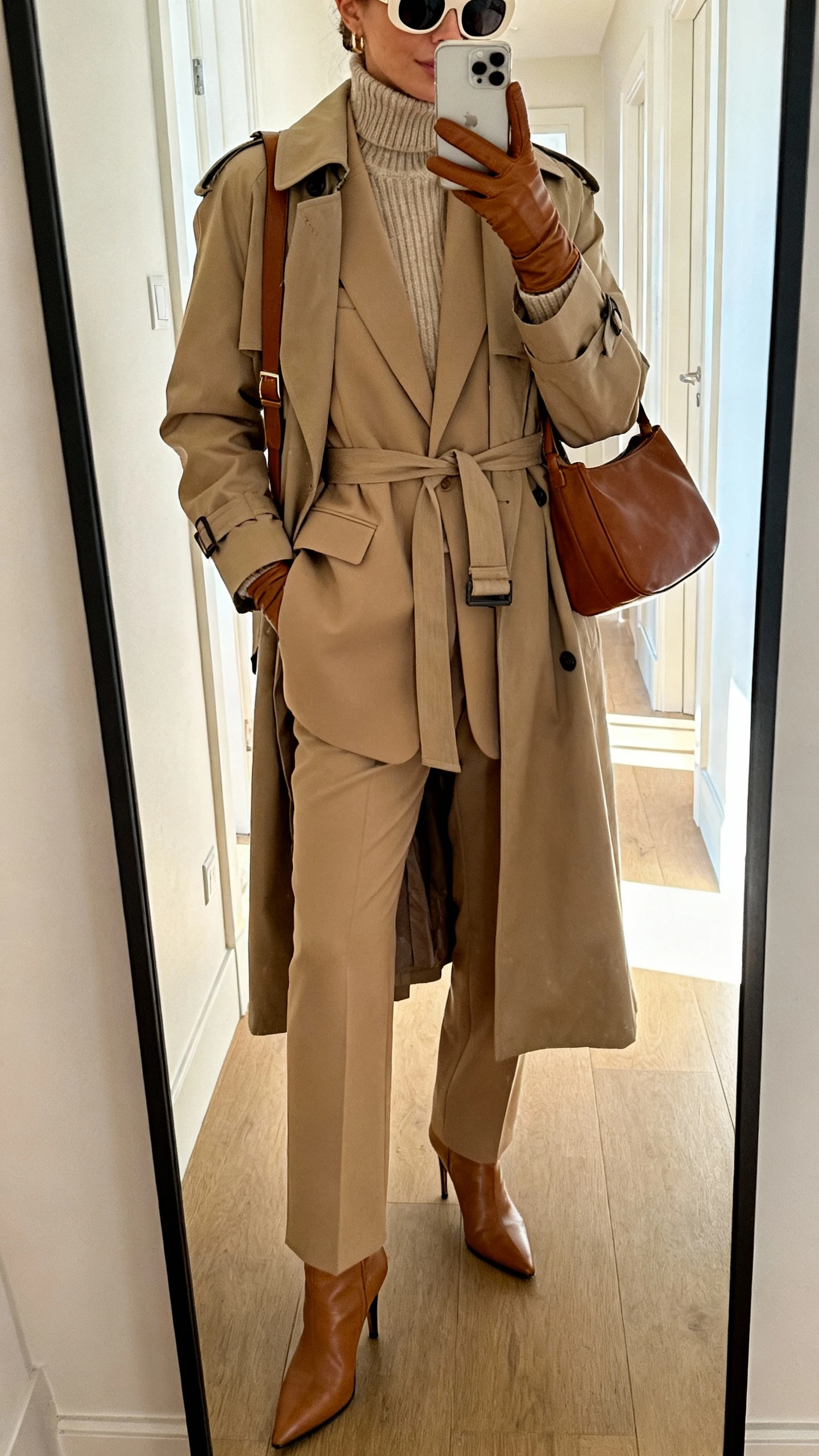 - Choose hemlines that stagger: trench slightly longer than the blazer, trousers skimming the shoe.
