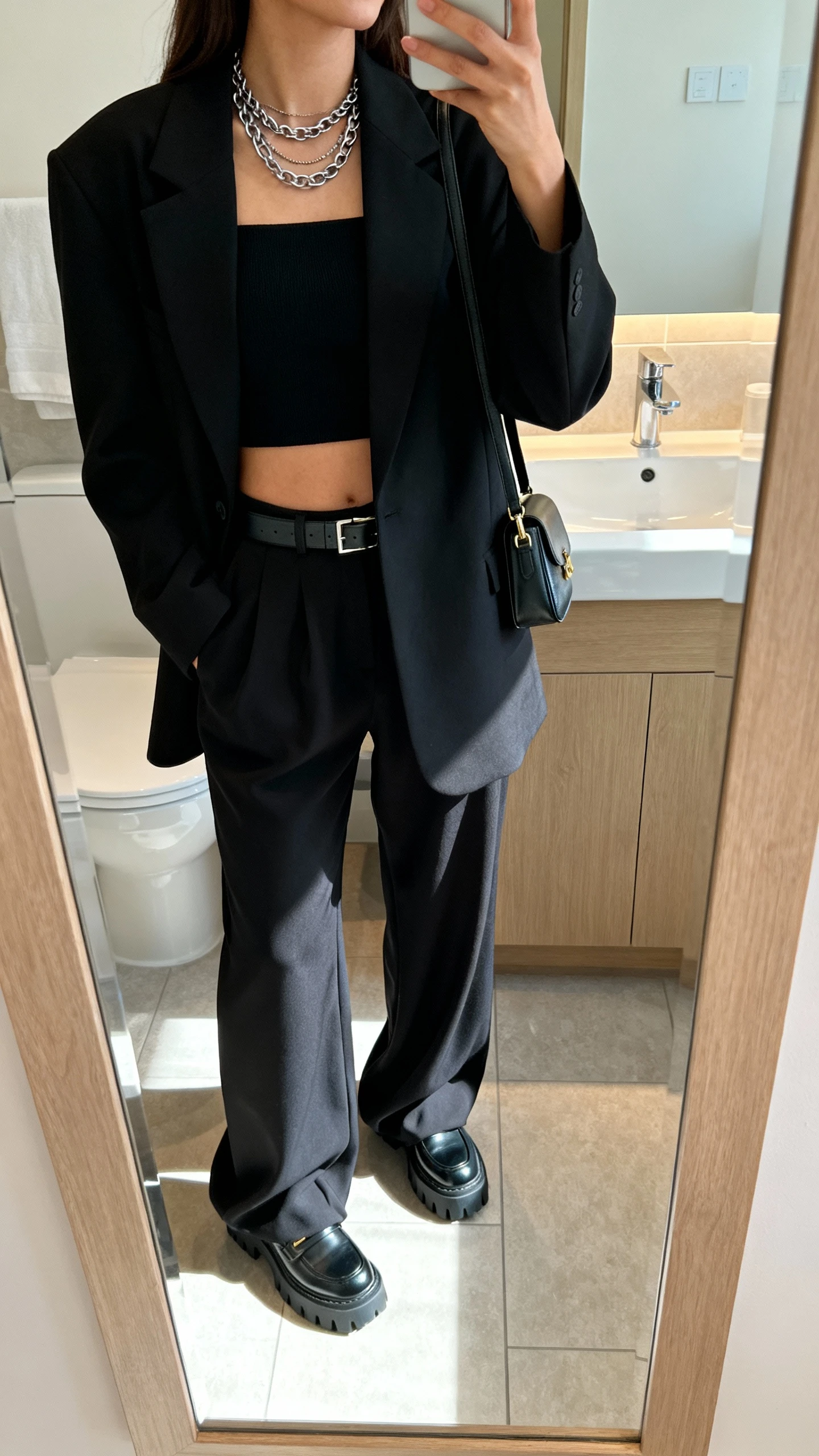 Big suit, small top: it’s the easiest proportional trick in the book. A cropped top or bralette under an oversized blazer gives you negative space up top and keeps everything feeling light, not boxy. It’s confident, cool, and surprisingly wearable.