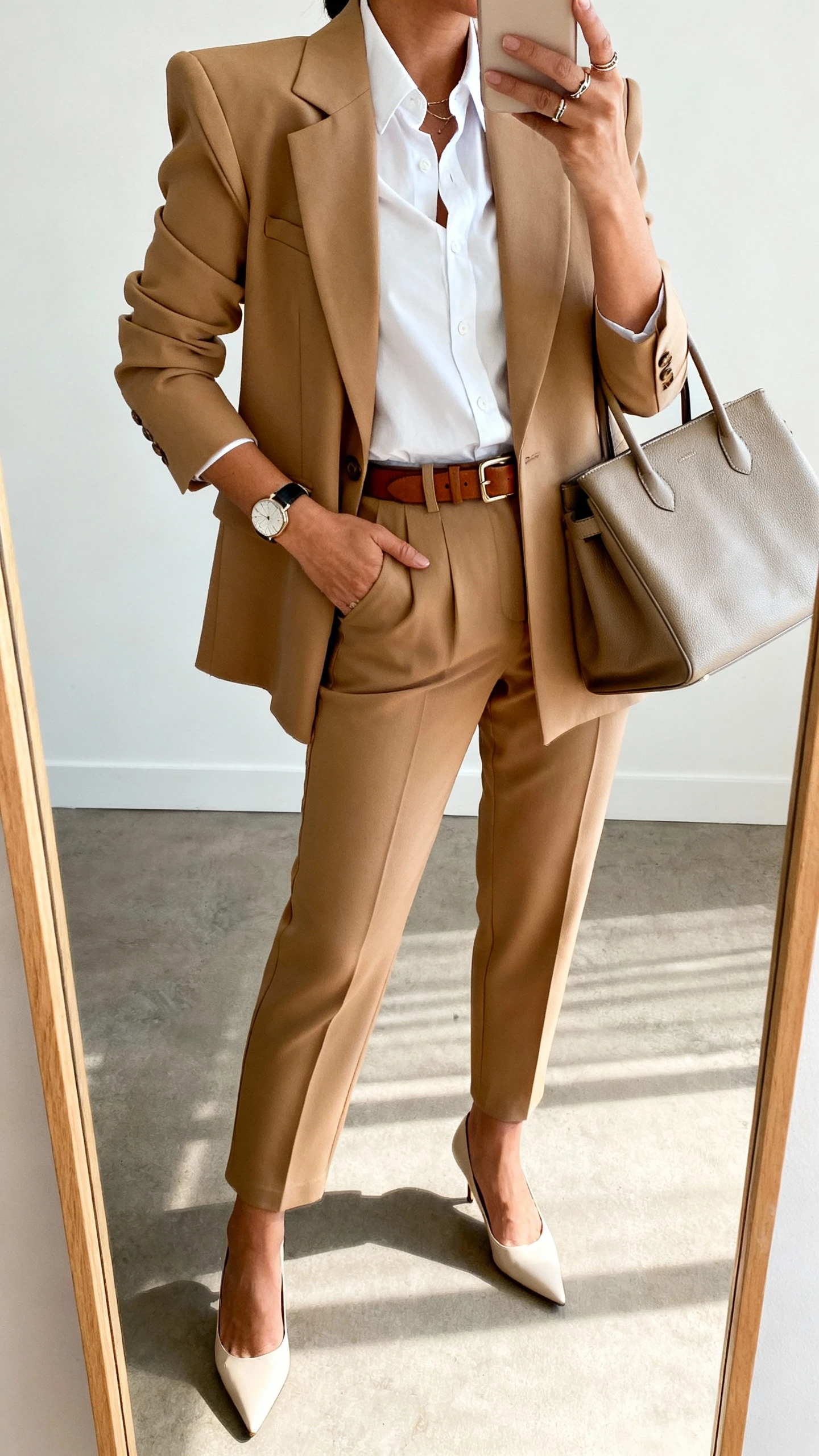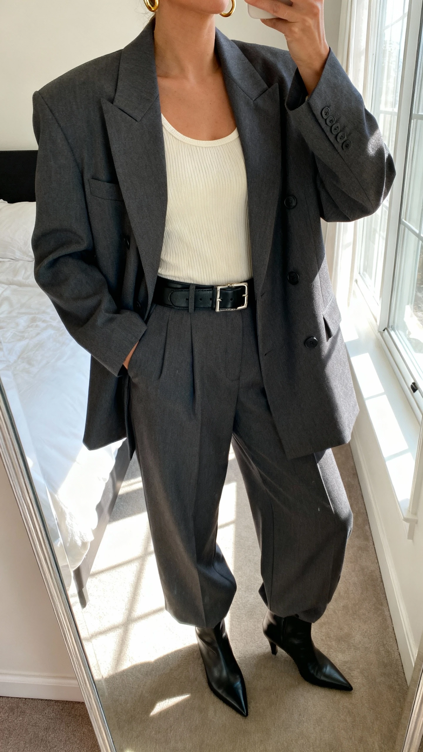 This look proves you can have a roomy suit and a defined shape at the same time. The secret weapon is a belt or built-in tie that hugs the waist and gives the blazer structure. It’s polished without trying too hard—and it works on pretty much every body type.