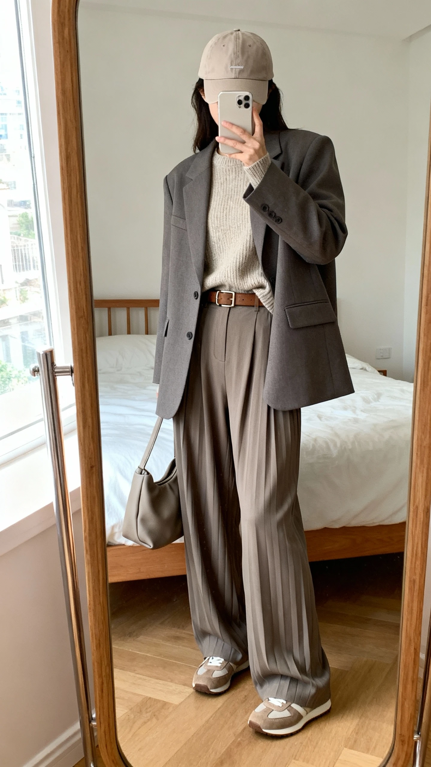 For that quiet-luxury vibe, try a lightweight knit half-tucked into roomy trousers with your blazer tossed on top. It’s cozy, slouchy, and still refined—like you just stepped out of a fashion campaign. A baseball cap adds a casual twist so it doesn’t feel precious.